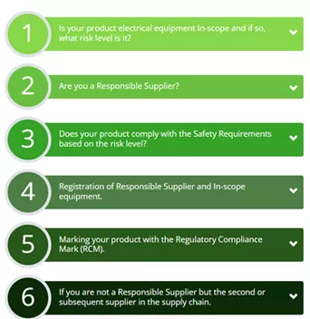 EEE objęty zakresem (IN-SCOPE) może być importowany lub produkowany w Australii lub Nowej Zelandii wyłącznie przez Dostawcę Odpowiedzialnego (Responsible Supplier - RS), który musi być prawnie identyfikowalnym podmiotem lub osobą prowadzącą działalność gospodarczą w AU i/lub NZ. Dostawcy Odpowiedzialni (RS) ponoszą główną odpowiedzialność za zapewnienie zgodności EEE z przepisami dotyczącymi bezpieczeństwa elektrycznego, co obejmuje wymogi rejestracji i oznakowania.